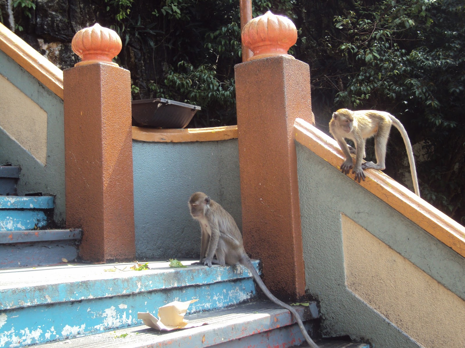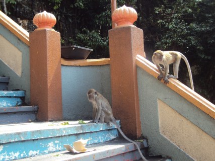 Monkeys can be seen just about anywhere in Batu Caves waiting for some food to be tossed at them by the religious people visiting the temples.