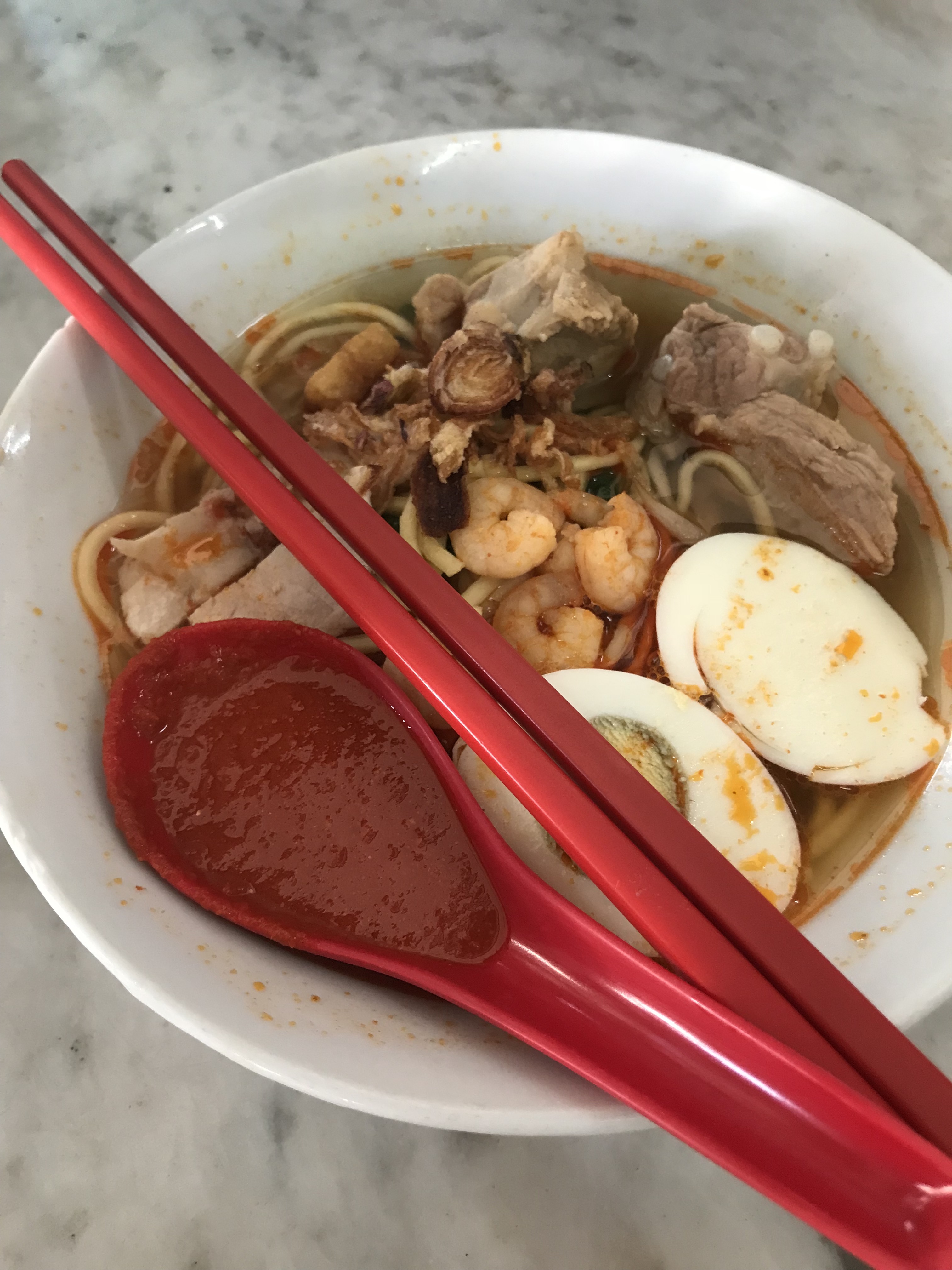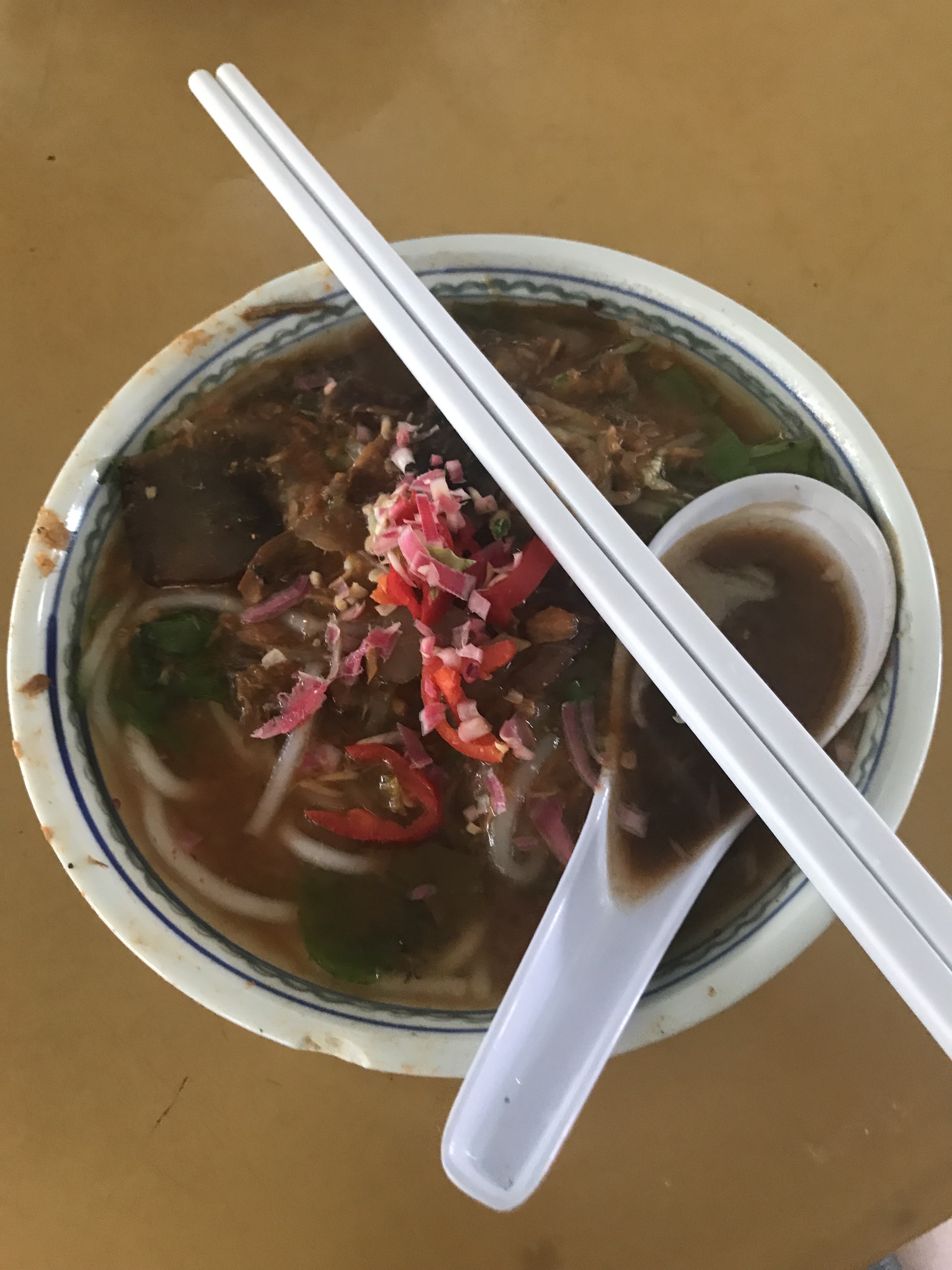 The laksa we are accustomed to has coconut milk & curry in its soup. Well, Penang laksa is a world away from that. Similarly it has noodles, greens and proteins like chicken, but the broth is actually thicker, sour & spicier. Yes, SOUR. And yes, delish!!!